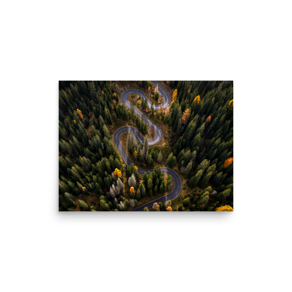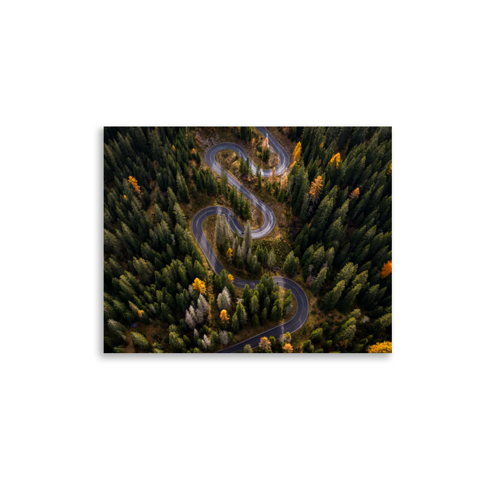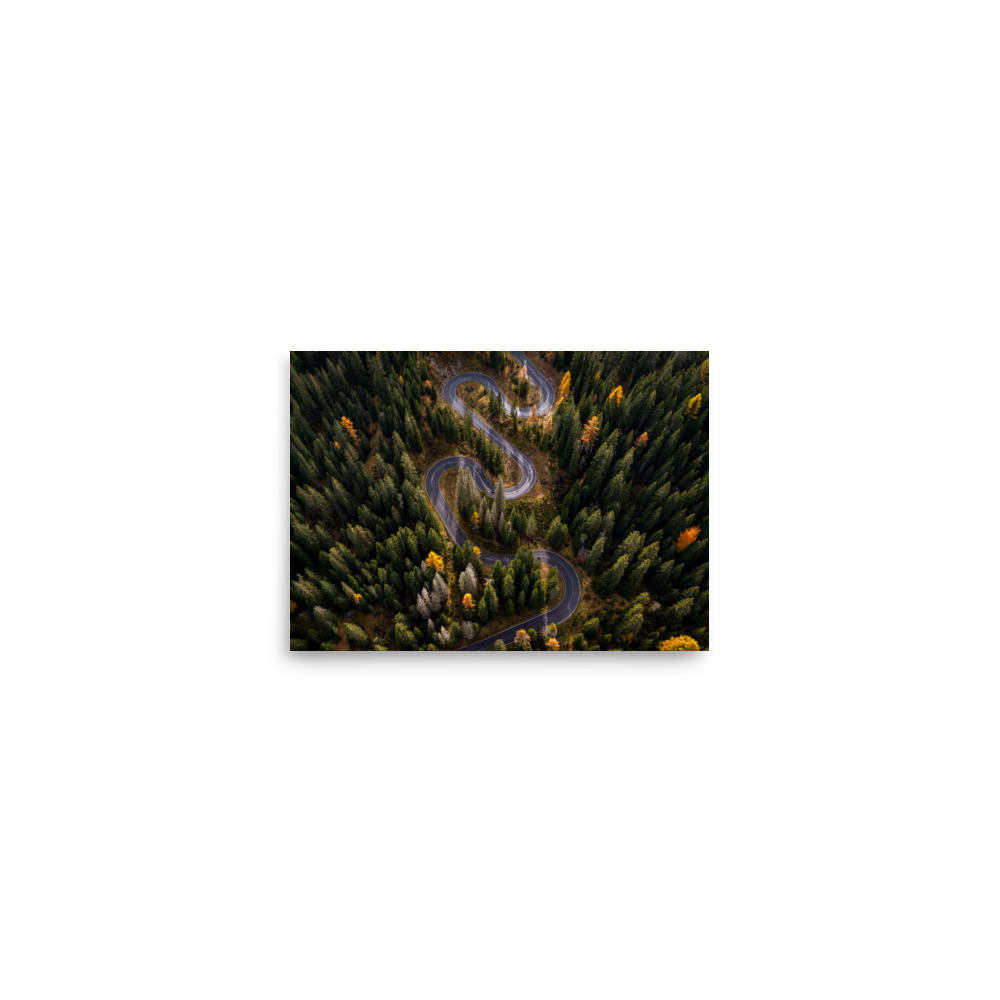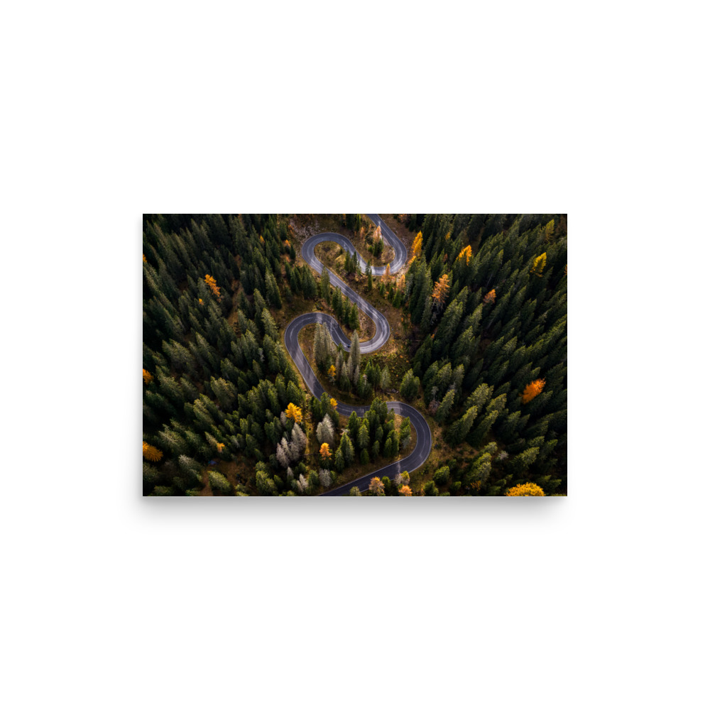 A winding road surrounded by pines and golden larches in the middle of the Italian Dolomites.